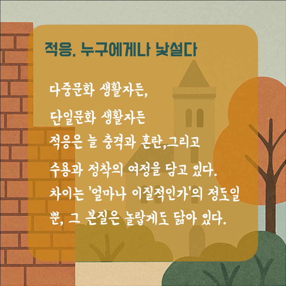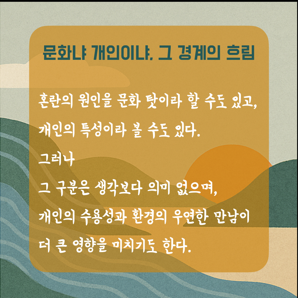다중문화 생활자들의 삶에서 적응과정이란, 소위 단일문화 생활자들의 삶에서의 적응과정과는 크게 다를 것이라 여겨지지만, 실제로는 충격과 그로부터의 혼란, 수용과 정착의 과정이 유사하다. 물론 그 과정에서 ‘얼마나 이질적인가’에 따라 혼란의 강도와 수용의 여정이 달라질 수는 있다. 그러나 그것이 문화적 차이에서 기인한 것인지, 개인적 차이에서 비롯된 것인지를 명확히 가르는 일은 생각보다 쉽지 않다. 우리가 그 현상에 문화적 차이를 대입하든, 개인적 차이를 대입하든, 결국 그에 따른 해석과 대응은 가능하다. 이는 곧, 문화냐 개인이냐를 구분하려 애쓰는 일 자체가 실은 그다지 의미 없을 수 있으며, 오히려 개인의 수용성이나 주변 환경과의 우연한 연계성, 그 출현에 더 무게를 두어야 한다는 의미이기도 하다. 결과를 통해 과거를 바라보면 모든 것이 인과적으로 보이지만, 현재의 현상 안에서 지금의 상황을 고찰해보면, 그것은 우연의 작동일 때가 많다.