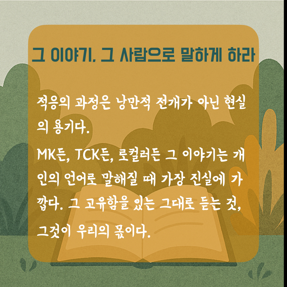 결국, 우리는 충격과 혼란, 수용과 정착의 과정을 어떤 낭만적인 전개로 기대하기보다는, 그것을 있는 그대로 직면할 수 있는 현실적인 용기를 얻는 것이 더 나은 대안이라 생각한다. MK든, TCK든, 로컬러든, 모든 이야기에는 저마다의 고유한 독특함이 존재하며, 그러한 이야기를 특정 부류나 집단의 특성으로 환원하기보다는, 그 개인을 통해 직접 말해지는 것이 더 정확하고 진실하다는 점을 우리는 기억할 필요가 있다.