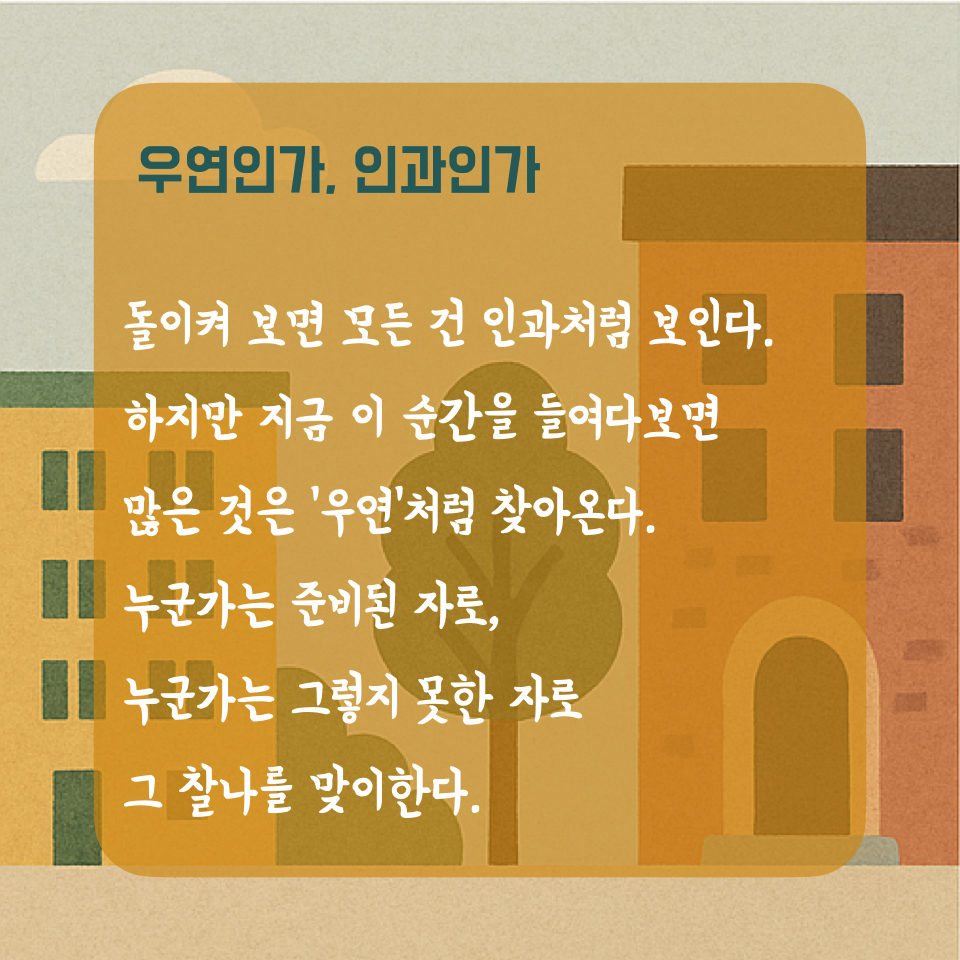 물론 그 우연 앞에서 어떤 이는 대처하고 적응할 기술을 지니고 있고, 어떤 이는 그렇지 못하기도 하다. 그러나 그 찰나의 국면을 만나는 일은, 신의 점찍음이라 하지 않고는 설명할 수 없을 정도로 희박한 우연일 때가 더 많다. 물론 이 말을 글자 그대로 받아들일 이들은 별로 없을 것이다. 이러한 우연만을 수용한다면 우리는 할 수 있는게 많지 않으니까. 맞다. 그런 우연의 흐름 속에서, 개인이 축적해온 경험들과 관계들이 만들어내는 ‘개화의 순간’을 떠올려 보면, 우리는 또한 인과성을 쉽게 부정할 수도 없다.