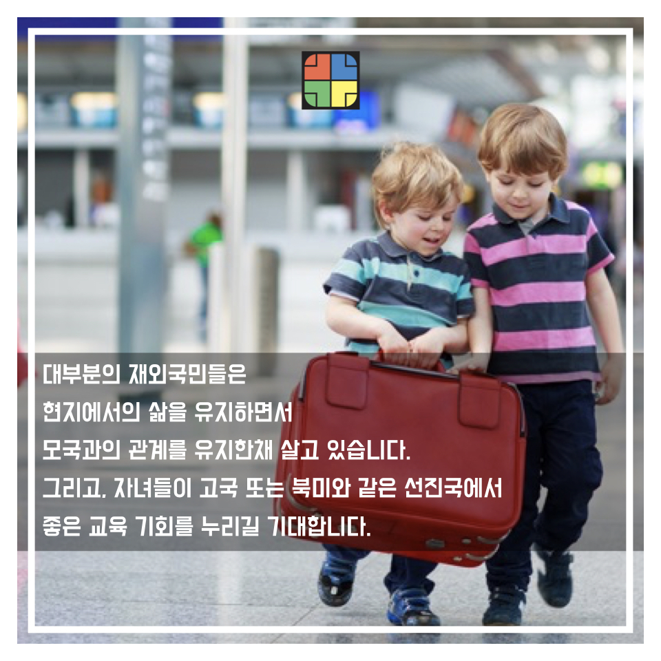 대부분의 재외국민들은 현지에서의 삶을 유지하면서 모국과의 관계를 유지한채 살고 있습니다. 그리고, 자녀들이 고국 또는 북미와 같은 선진국에서 좋은 교육 기회를 누리길 기대합니다.